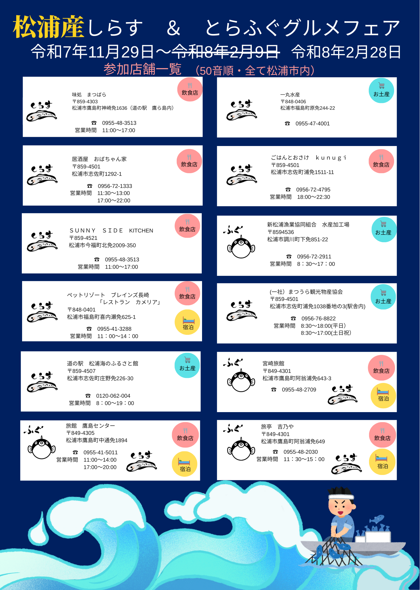 しらす & とらふぐ グルメフェア開催中!! この時期しか漁獲されない超希少な松浦産「しらす」と 日本一の生産量を誇る養殖「とらふぐ」を使った料理を 市内飲食店や宿泊施設でグルメフェアを開催しています。 九州では珍しい「生しらす」を使った海鮮丼や 食感と風味が抜群の「釜揚げしらす」のパスタや丼など 各店舗で趣向を凝らしたメニューが提供されています。 この機会にぜひ松浦でお召し上がりください。 【 イベント概要 】 令和8年2月28日(土) ◇ 期間 令和7年11月29日 (土) ~令和8年 2月9日 (月)「いいフグの日」から「フグの日」までと覚えてください! ◇ 参加店舗:12店舗 ※ 「道の駅 松浦海のふるさと館」「新松浦漁業協同組合水産加工場」 「一丸水産」「まつうら観光物産協会」は、販売のみ取り扱っています。 ◇ グルメフェア期間中に対象メニューを注文し アンケートにご協力いただいた方の中から、 松浦の特産品などの豪華賞品が抽選で当たる キャンペーンも行っています。 ※ 詳細はチラシをご覧ください✨